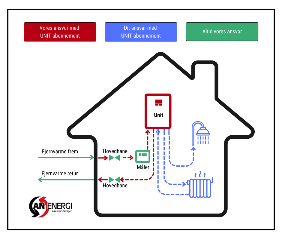 Vi er forpligtet til at tilse fjernvarmeunitten og afhjælpe opståede fejl inden for vores åbningstid. Vagten kan kontaktes uden for ordinær åbningstid.