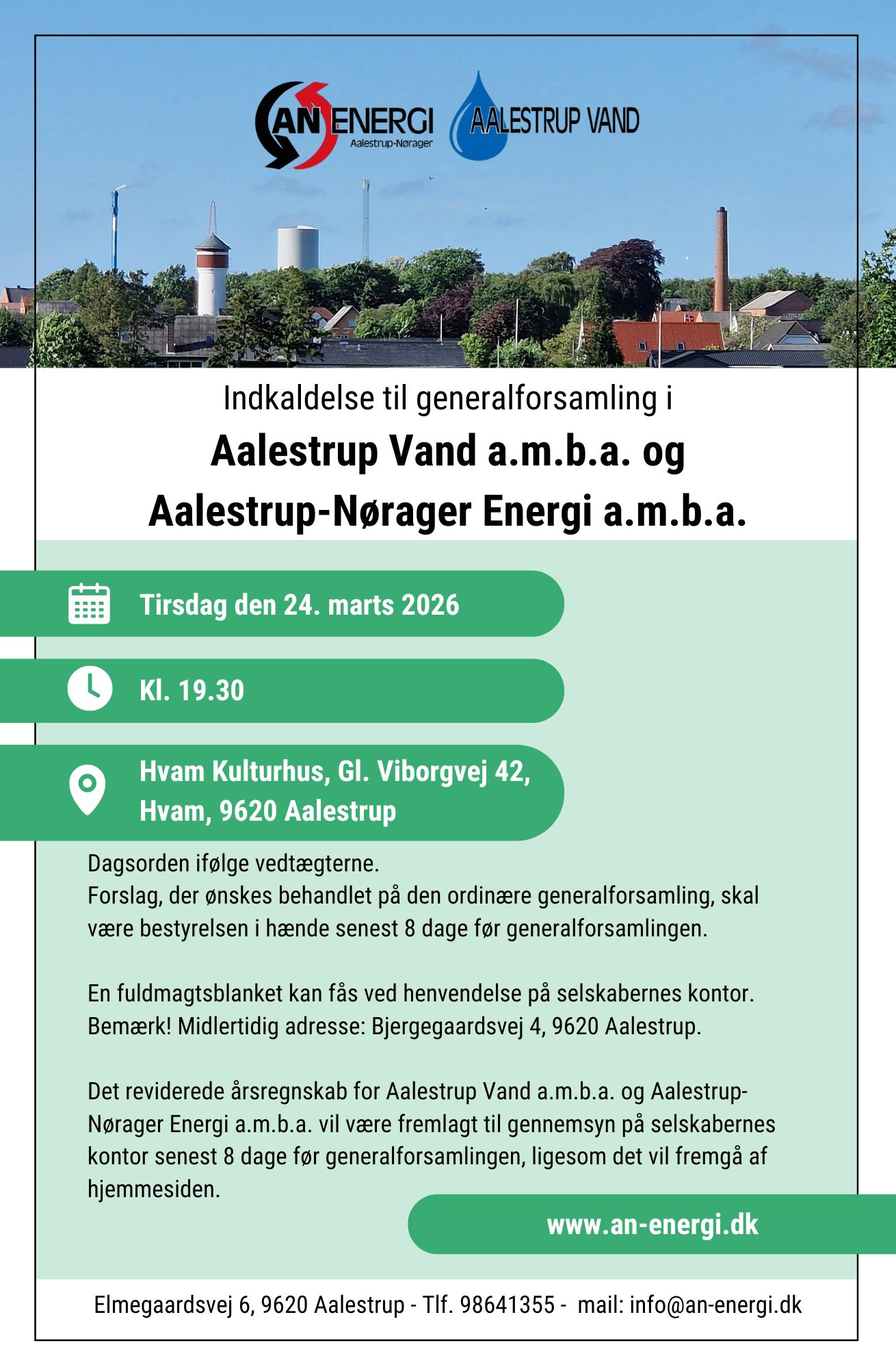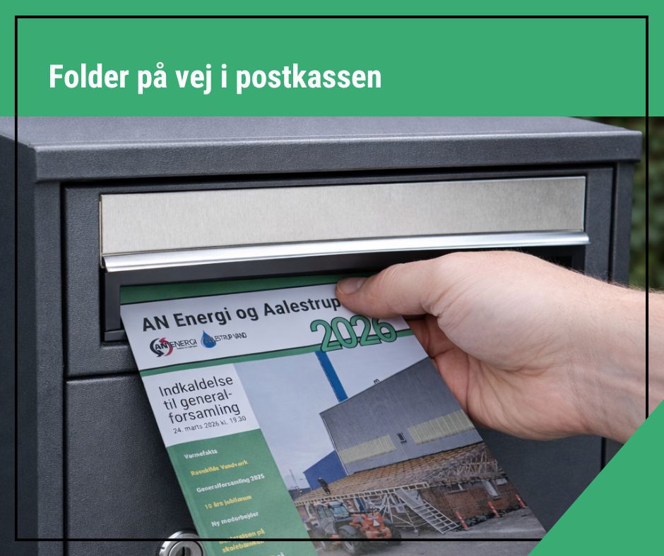 Som tidligere år har vi valgt at indkalde til generalforsamling for AN Energi og Aalestrup Vand med en folder. Her har vi mulighed for at give jer information om jeres vand- og varmeforsyning.
