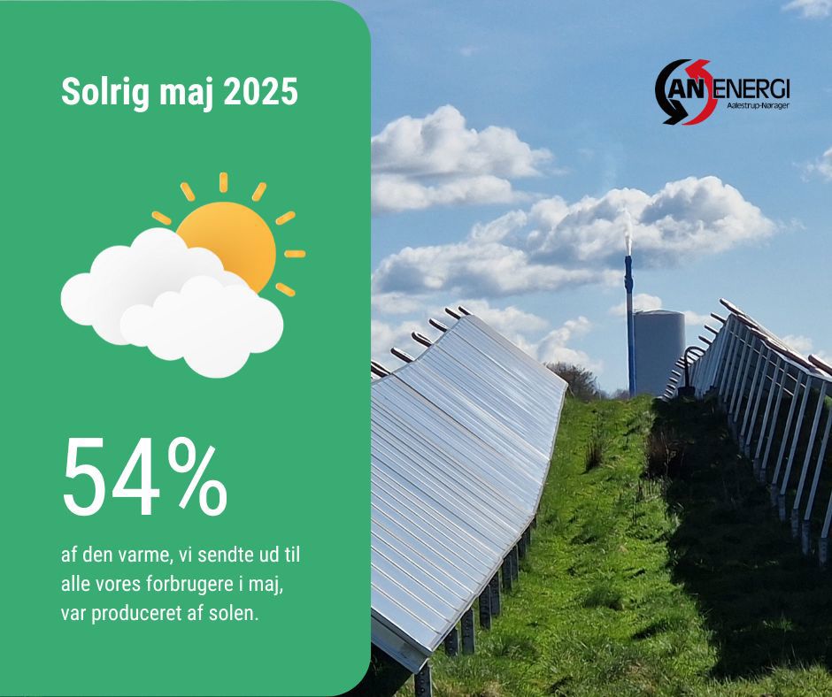 Ved hjælp fra vores solfangere, producerede solen 54% af den varme, vi sendte ud til alle vores forbrugere i maj.