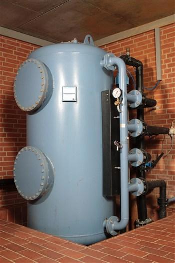 Vandet kommer fra råvandsledningen og ind i filtertanken, hvor det renses for jern m.m. Herefter pumpes det rensede vand ud i rentvandstanken.