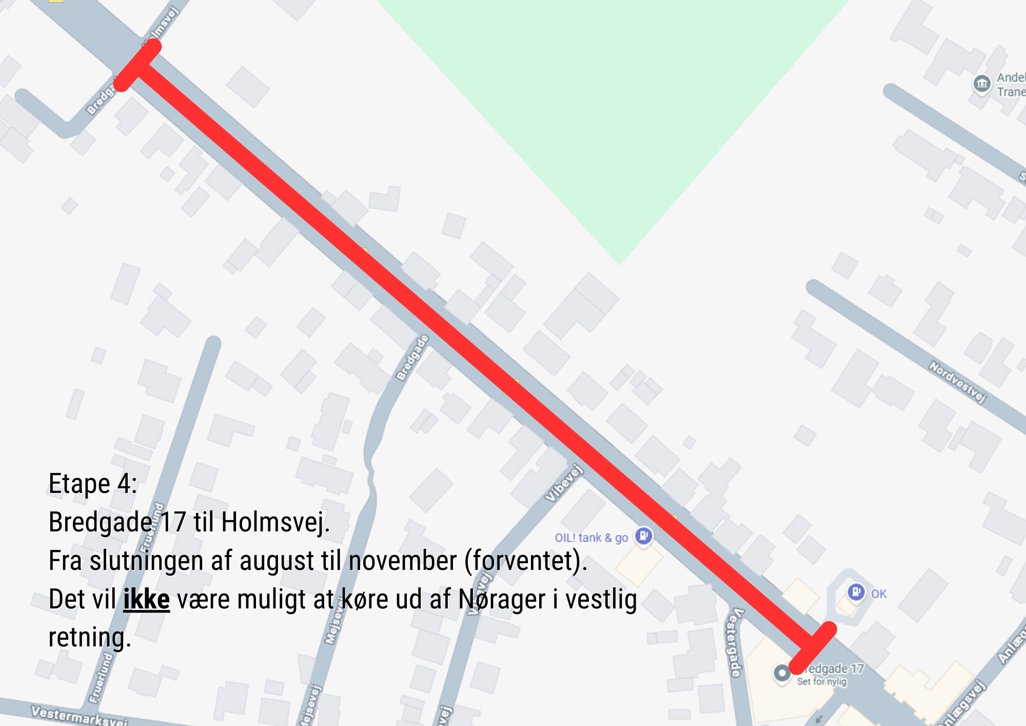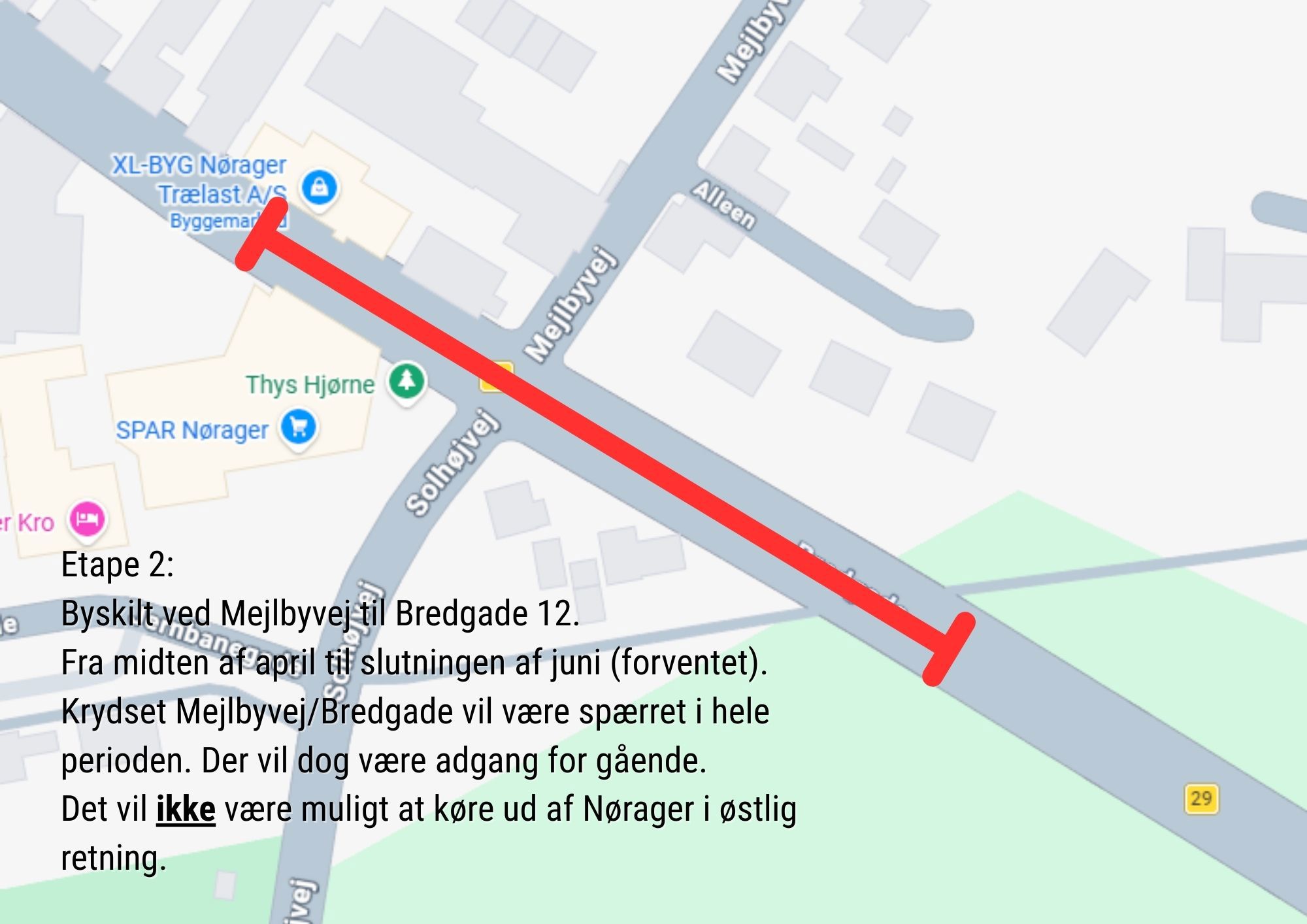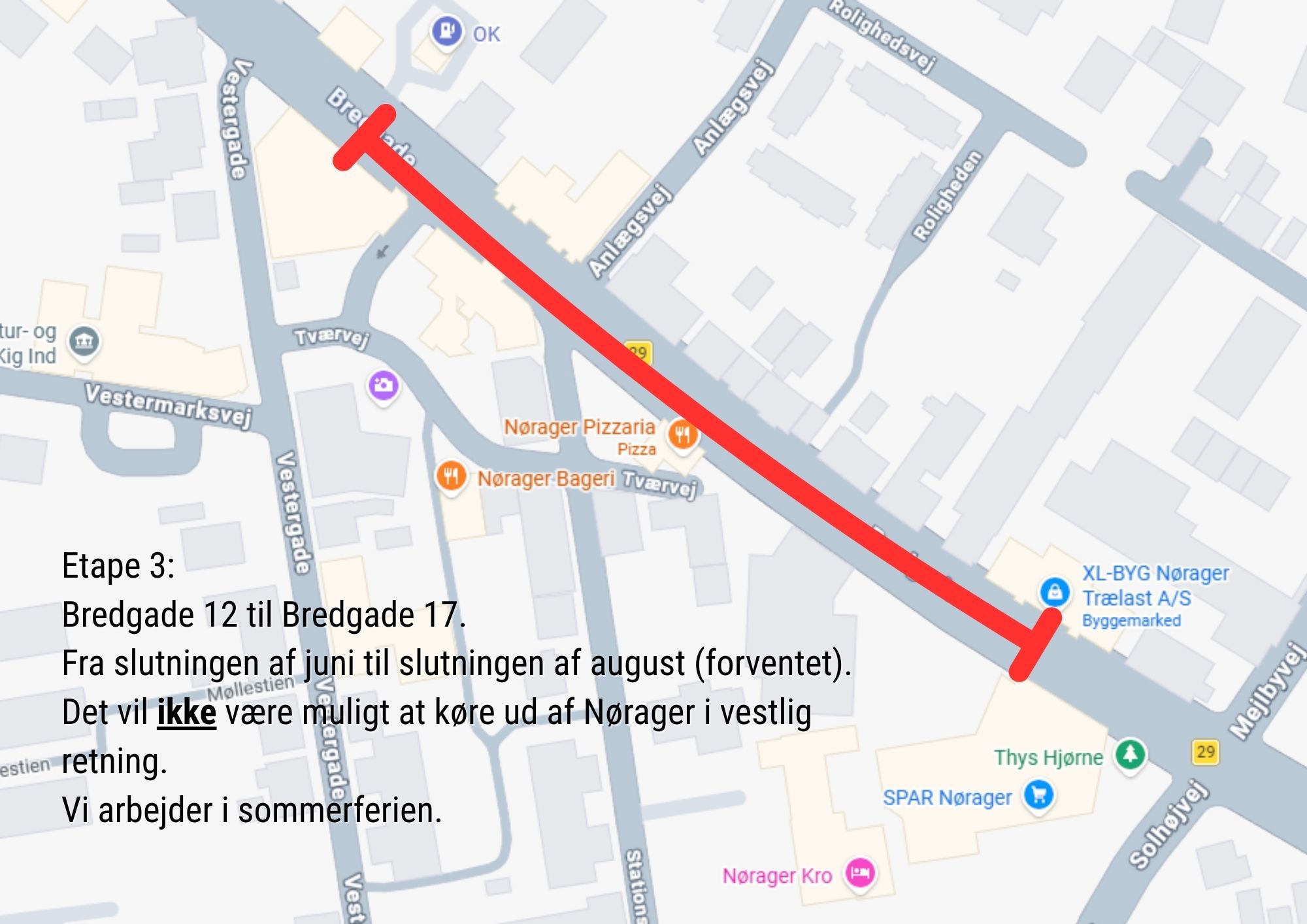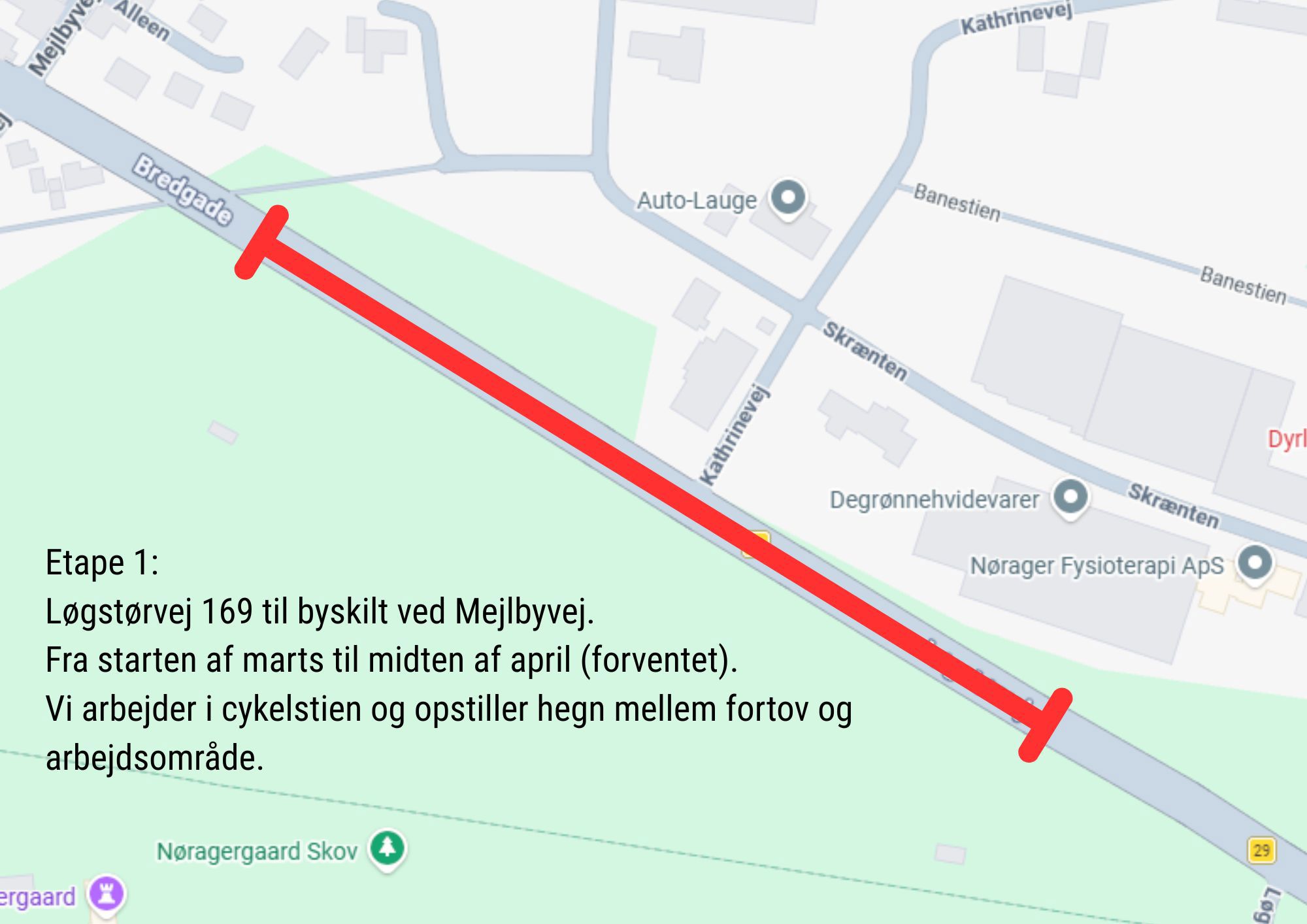 De trafikale forhold ændres undervejs for bilister, cyklister og fodgængere, og der kan forekomme støj, støv, arbejdskørsel, vejspærringer, omkørsler samt ændrede adgangs- og parkeringsforhold. Vi opfordrer alle i Nørager til at følge den opstillede skiltning.